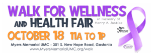 10th annual memorial fitness event to honor the late Rev. Henry A. Justice, United Methodist Minister. This is a Health Fair and Fitness event sponsored by the Health Cabinet at Myers Memorial UMC to raise money for Cancer Services of Gaston County. All proceeds benefit Cancer Services of Gaston County, who provides support to patients and families LOCALLY that have been affected by cancer.
