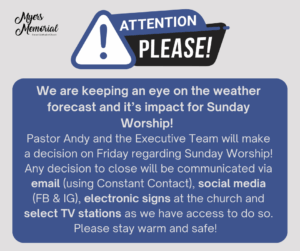 We look forward to welcoming you to Myers Memorial United Methodist Church.