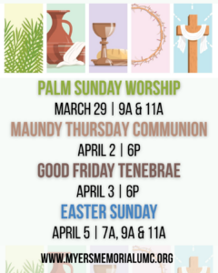 We look forward to welcoming you to Myers Memorial United Methodist Church.